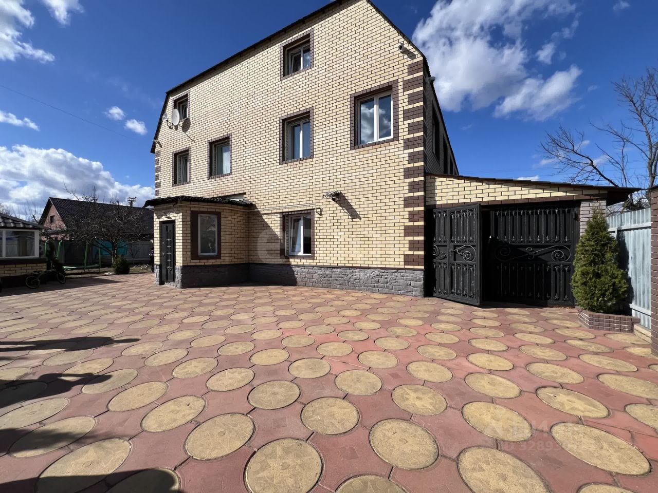 - **Материал стен**: облицовочный кирпич (светло-бежевый с декоративными элементами)