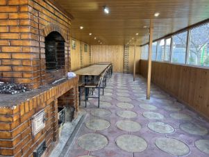 - Крытая терраса с деревянным потолком и стенами — тепло и уютно в любую погоду