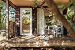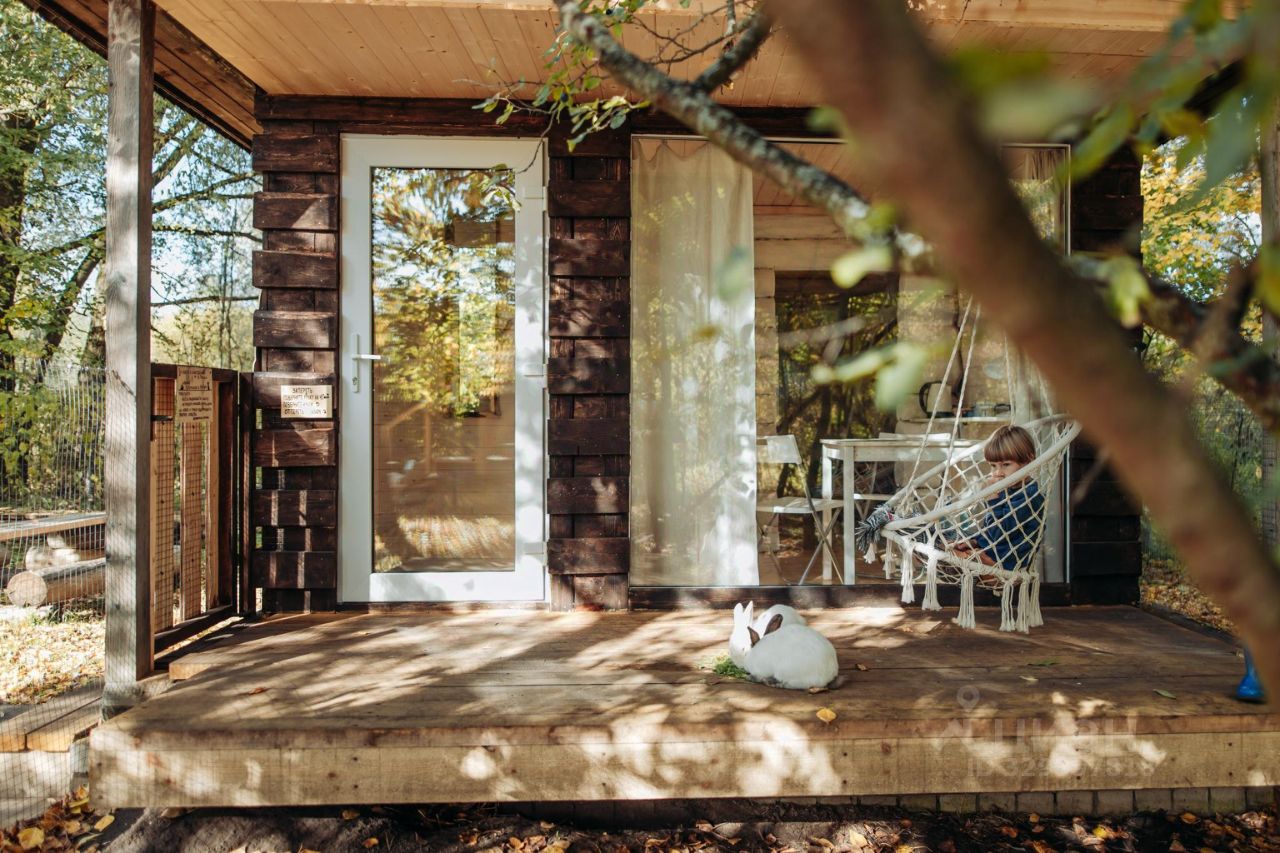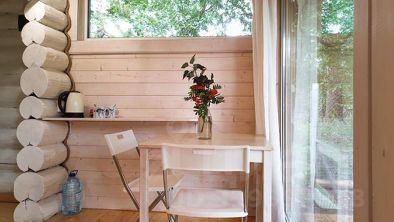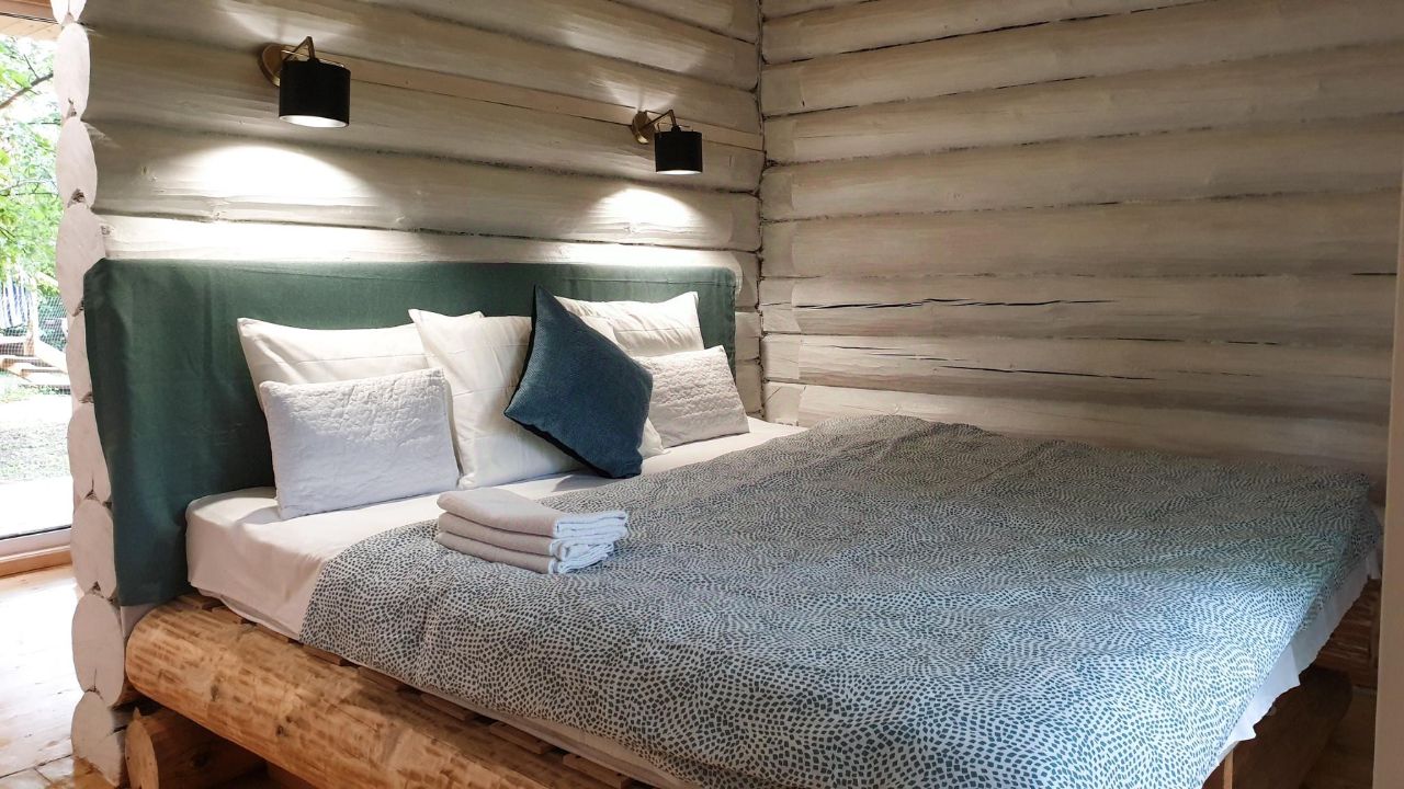 Большое окно из спальни выходит на лес Национального Парка. Стены домика из бревен, полы деревянные, а на широкой бревенчатой кровати лежит высокий ортопедический матрас. Возле домика живет семья кроликов, за их жизнью можно наблюдать через панорамное окно или сидя на веранде. Кроликов можно кормить овощами, фруктами и свежей травой. В домике биотуалет. Душевая и кухня в основном здании в 80 м. Рядом с домиком мангал, костер и стол для пикника.