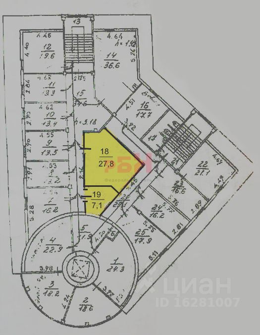 Общая площадь 35 кв. метров, на плане помещения с номерами 18 и 19.
