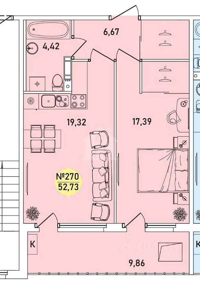 Общая площадь52,73 м²