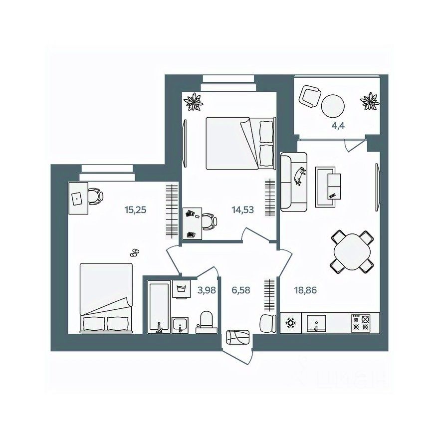 При разработке планировок квартир применяется зарекомендовавшая себя на практике концепция квартиры с большой комнатой, включающей в себя зоны гостиной, кухни и столовой. Эта комната является своеобразным аналогом общественного пространства для членов семьи. Спальни и детские комнаты запроектированы меньшего размера, но с полным учетом всех необходимых функциональных зон и сценариев. Таким образом в каждой, даже однокомнатной квартире есть обособленные дневное общественное и ночное приватное пространства.
