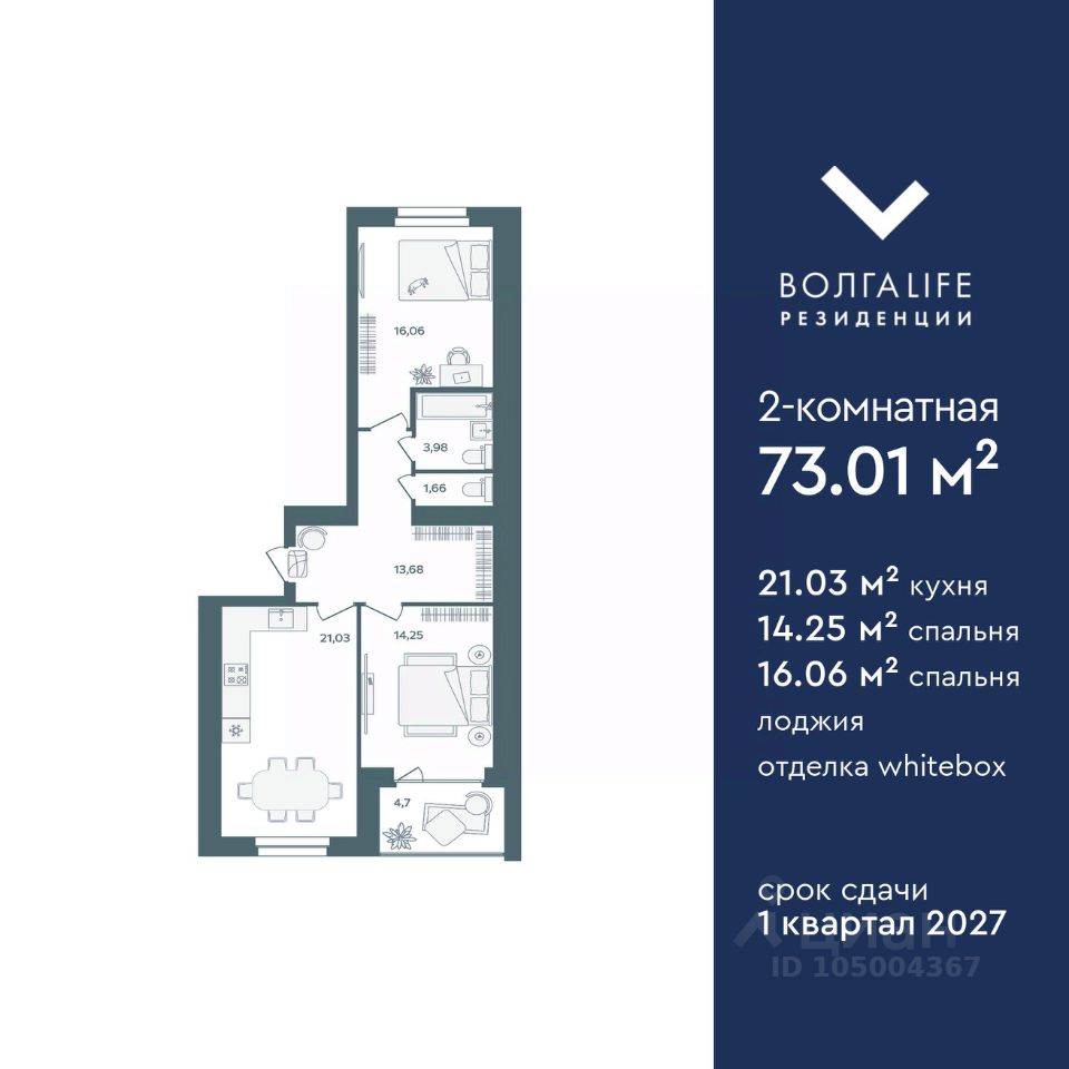 Продаётся 2-комнатная квартира в строящемся доме (Дом 2), срок сдачи: III-кв. 2026, общей площадью 73.01 кв.м., на 5 этаже. 8-и этажный жилой дом располагается по адресу : г. Ярославль, Тутаевское шоссе, д.60, параллельно Тутаевскому шоссе.