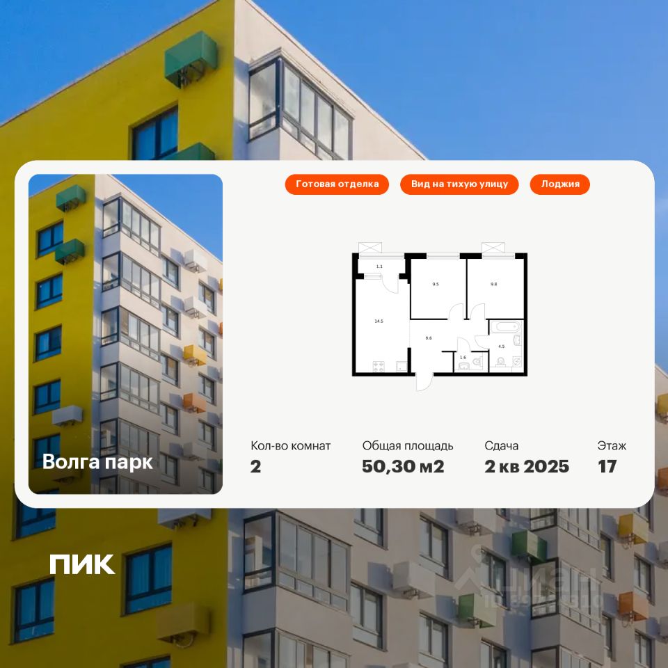 Продаётся 2-комн. квартира площадью 50,3 кв.м на 17 этаже 17 этажного дома (Корпус 6Б, Секция 1) проекта ПИК Волга парк. Светлый просторный подъезд на уровне земли, функциональная планировка, большие окна, c отделкой.