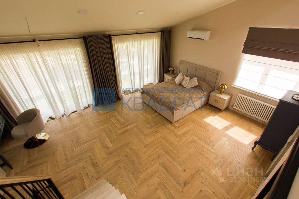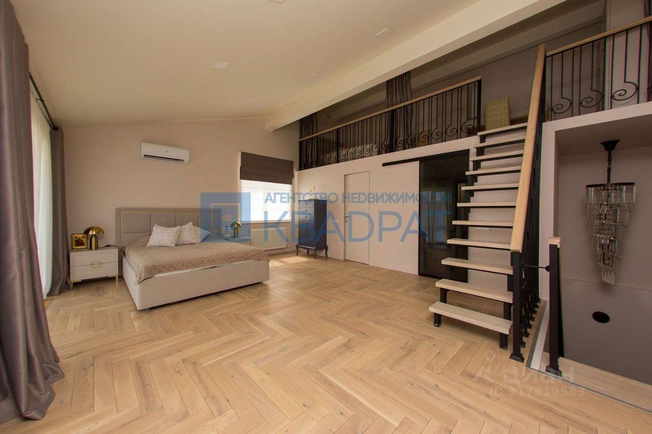 На второй этаж ведет дубовая лестница, там расположена спальня с панорамными окнами, сан/узел с ванной и гардеробная. Высокие потолки позволили сделать мансардный этаж. Остается все корпусная мебель и кровать с подъемным механизмом.