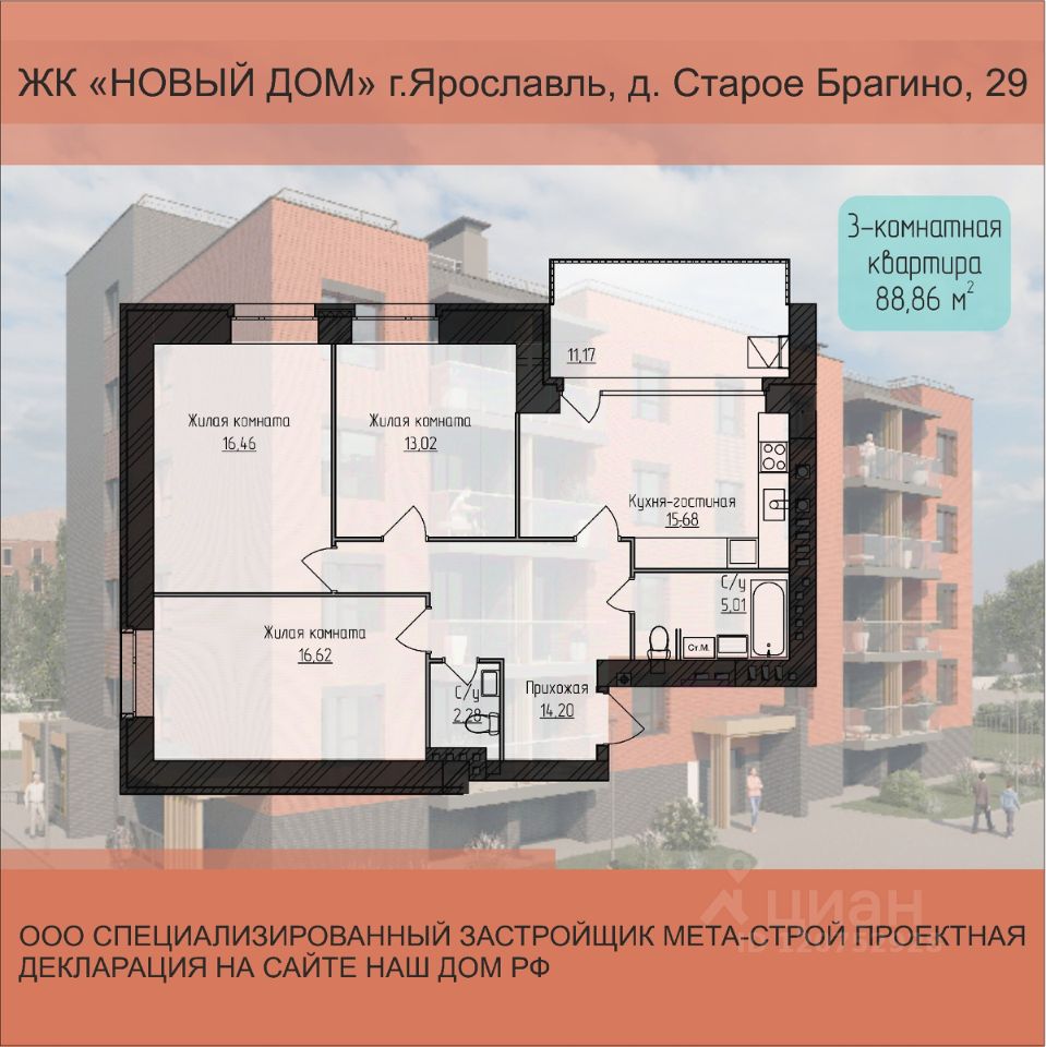 Продаётся 3-комнатная квартира в строящемся доме (Дом 29), срок сдачи: III-кв. 2026, общей площадью 88.86 кв.м., на 2 этаже. Новый жилой комплекс от застройщика "Строительный трест  1" расположен по адресу: Россия, Ярославль, Северный жилой район, деревня Старое Брагино