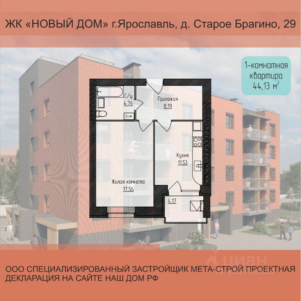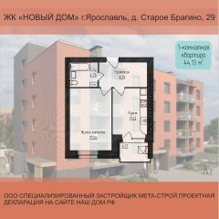 Продаётся 1-комнатная квартира в строящемся доме (Дом 29), срок сдачи: III-кв. 2026, общей площадью 44.13 кв.м., на 4 этаже. Новый жилой комплекс от застройщика "Строительный трест 1" расположен по адресу: Россия, Ярославль, Северный жилой район, деревня Старое Брагино