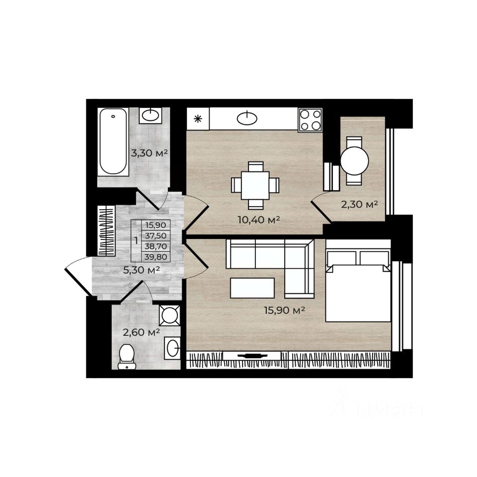 Общая площадь квартиры - 38,7 кв.м.