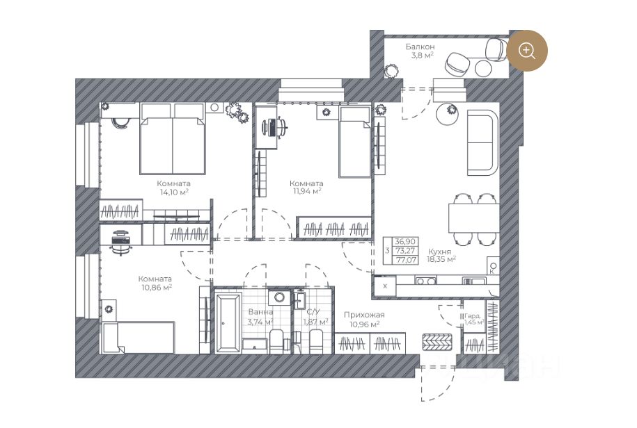 — Удачная планировка: три уютные спальни 14 кв. м.; 12 кв. м. и 11 кв. м. , кухня-гостиная площадью 18,35 кв. м. с выходом на застеклённый балкон.