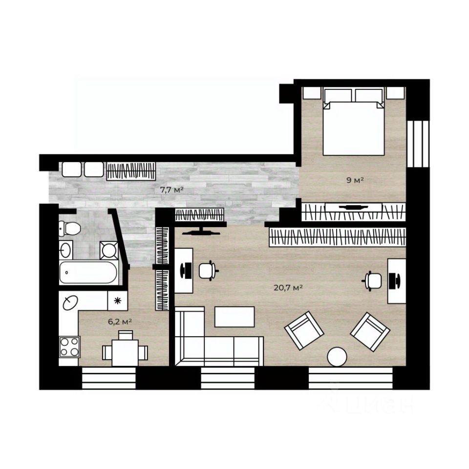 - кухня 6.2 кв.м., комнаты 20.1кв.м + 9 кв.м.;
