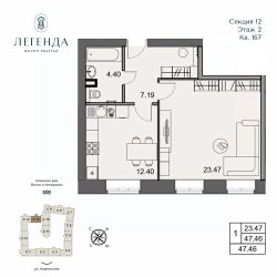 Продается светлая 1-комнатная квартира 47.46 кв.м. Этаж 2, подъезд 12.