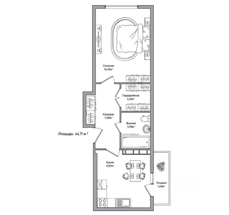 Общая площадь 44,71 м² — просторно, но по-домашнему уютно.