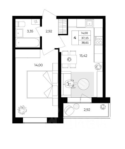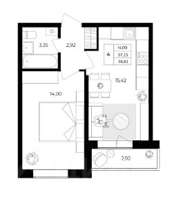 Планировка: большая комната 14 м² + кухня-гостиная 15 м² с балконом.