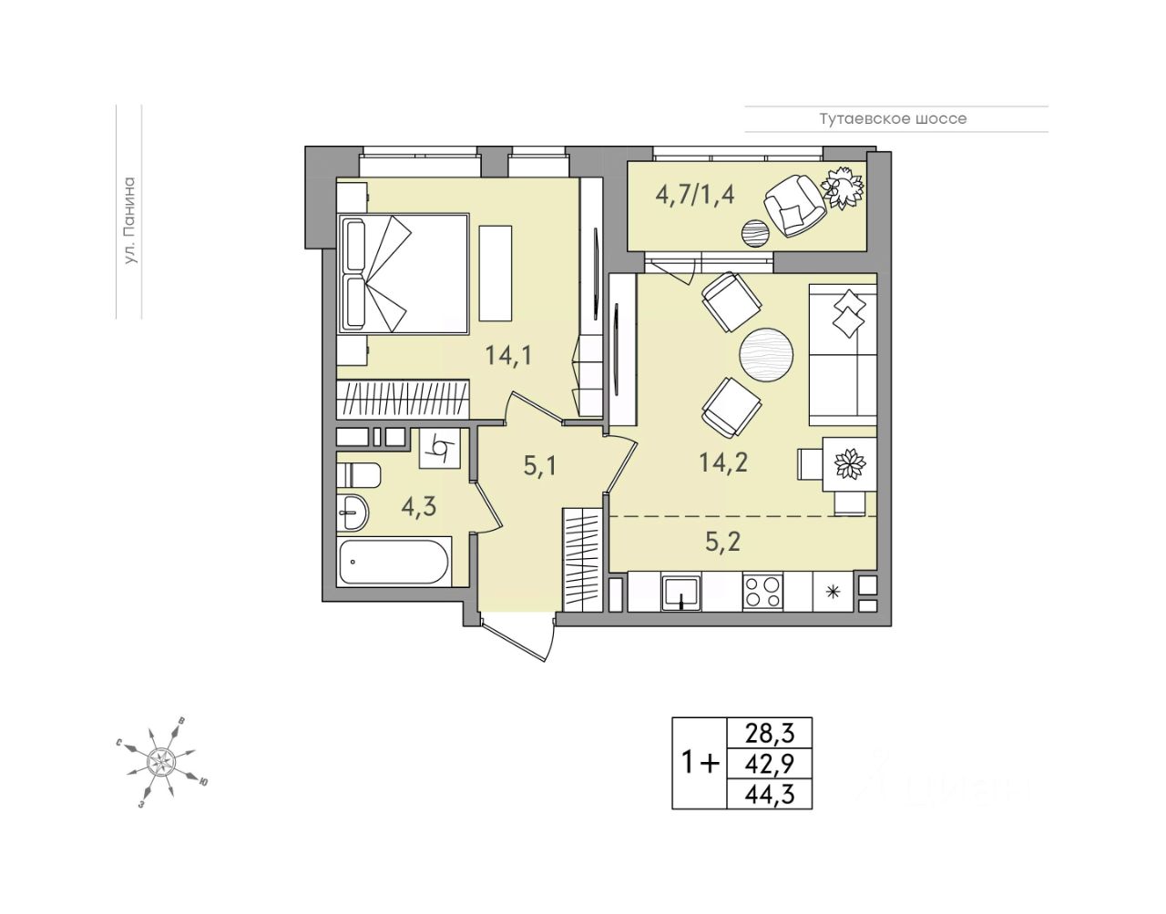 44,3 м²