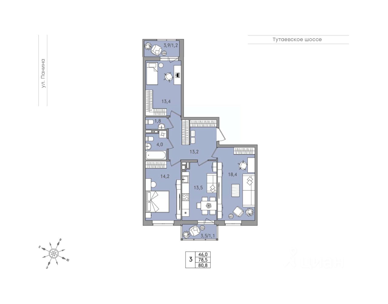 Просторная кухня 13,5 кв. м с местом под кухонный гарнитур и выходом на балкон 3,5 кв.м. Площадь кухни позволяет объединить  обеденное пространство и зону отдыха
