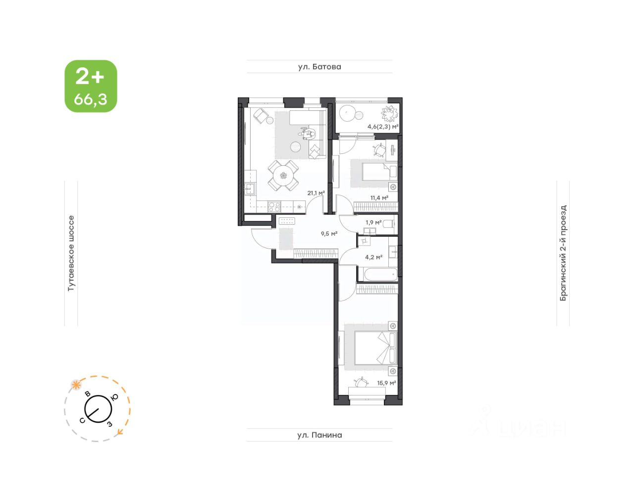 Спальня 11, 4 кв.м разделена на зоны работы и отдыха. Выход на собственный балкон 4,6 кв.м, который можно обустроить под дополнительную зону релакса.