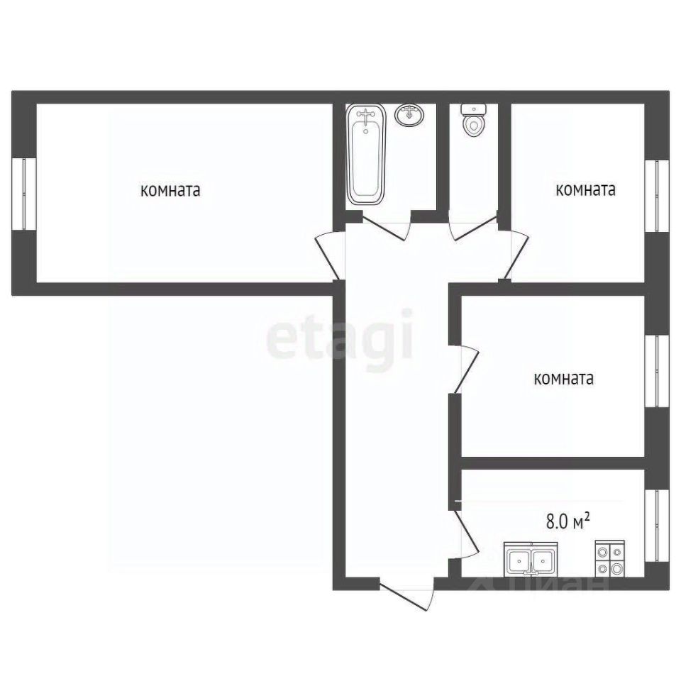-3 раздельные комнаты правильной формы и кухня 8м2.