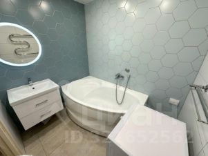 • Санузел 5 м² в плитке, просторная ванна, современная мебель и сантехника.