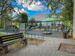 • Большая детская площадка с тренажёрами — детям и взрослым будет где провести время.