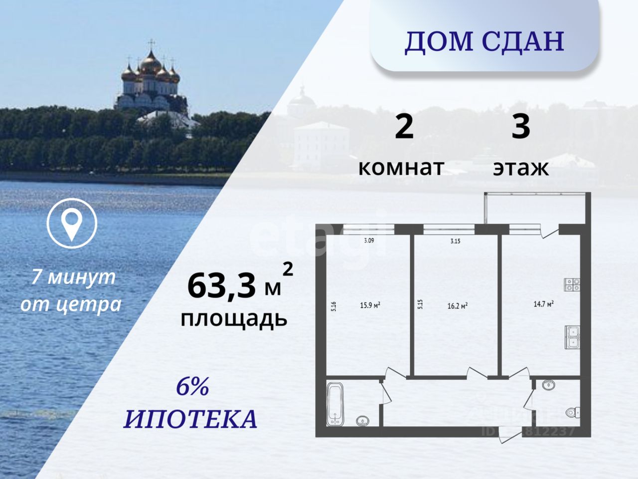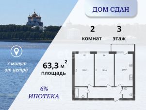 Продается просторная двухкомнатная квартира площадью 63.7 кв. м в новом жилом комплексе на Тверицкой набережной. Боковой вид на Волгу!