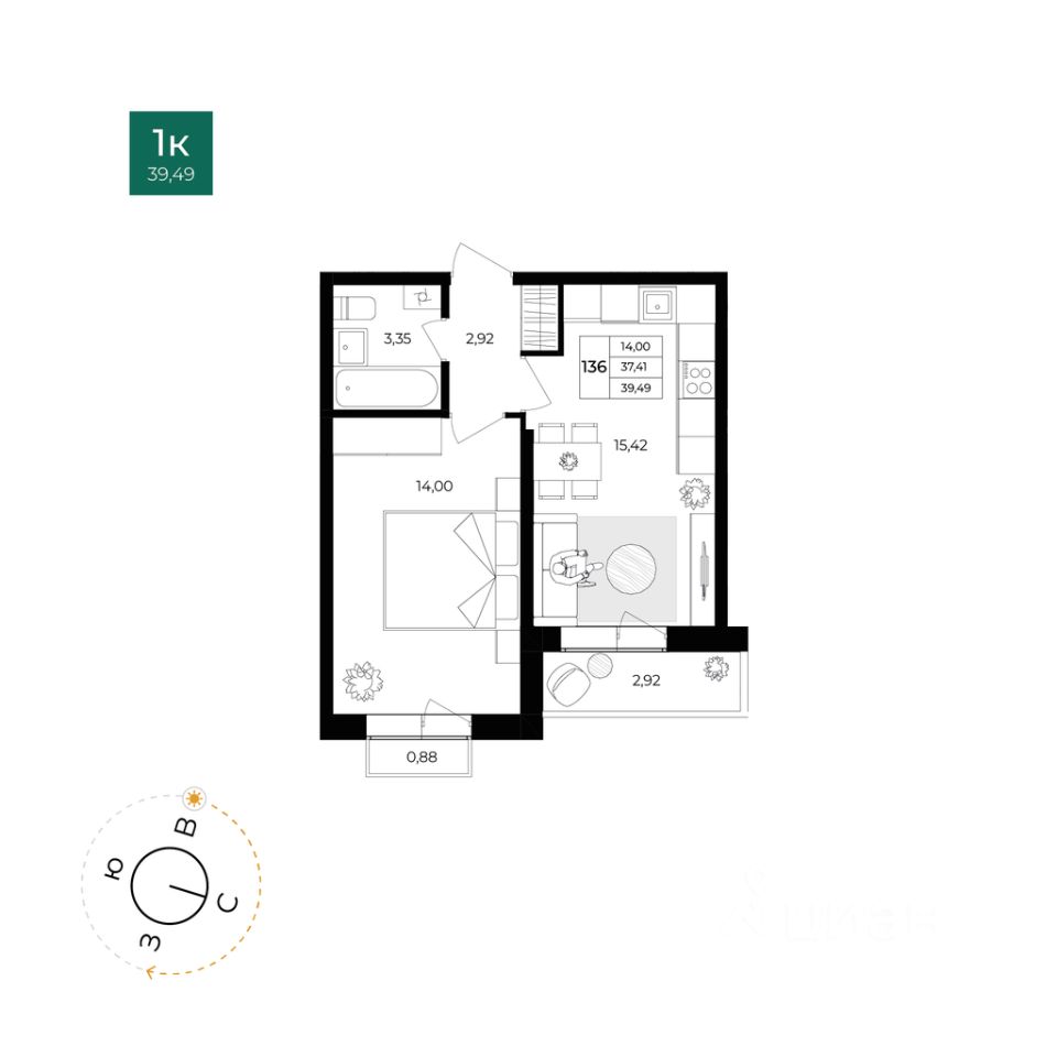 Общая площадь37,41 м²