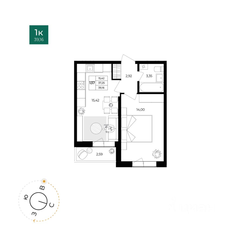 Общая площадь37,25 м²