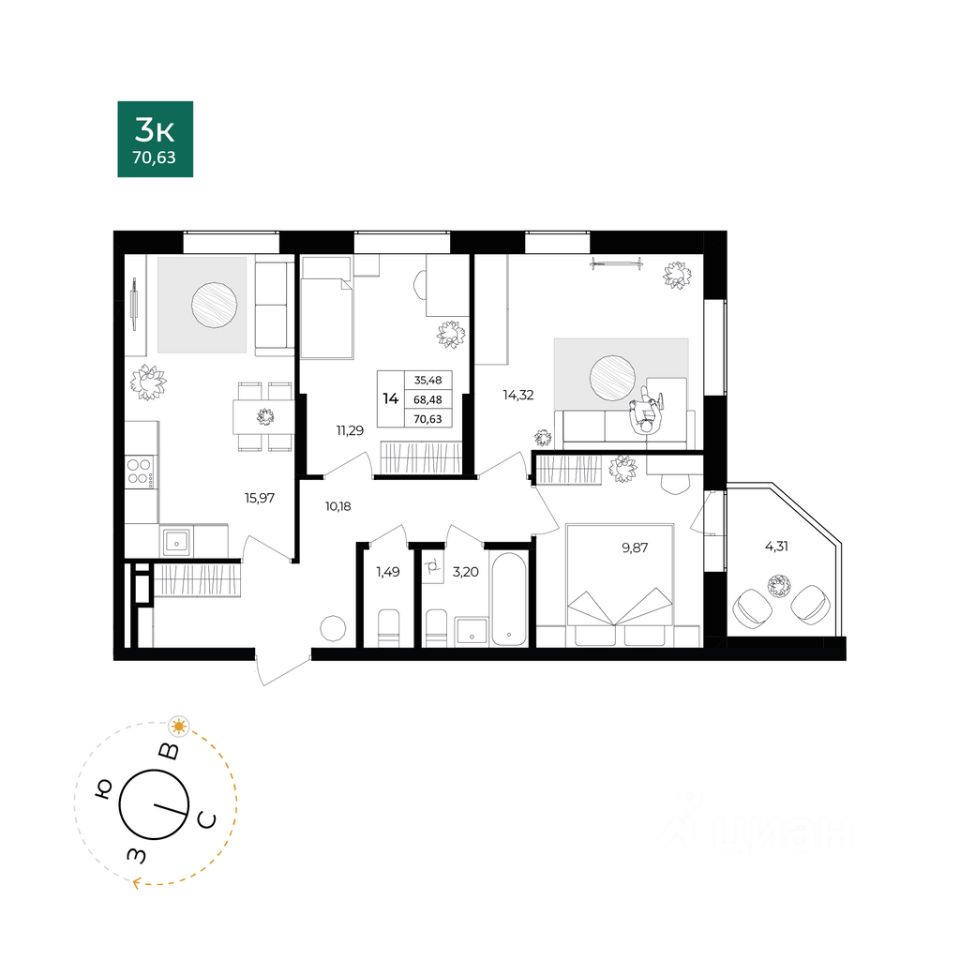 Общая площадь68,48 м²