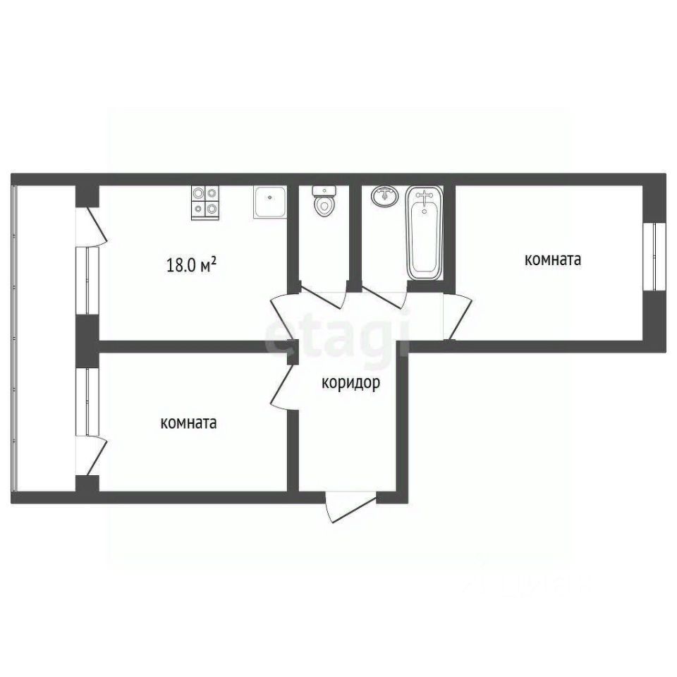 Общая площадь: 63 кв.м. Жилая зона: 30 кв.м., просторные раздельные комнаты.