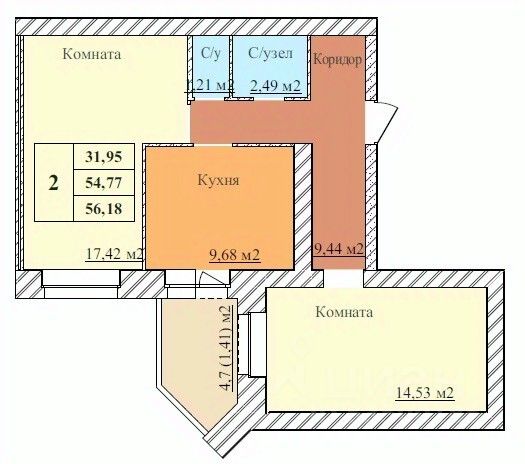 2-комн. квартира, 56,18 м²