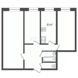 Площадь: Общая 58.6 м², кухня 8 м² — компактно, но функционально, с удобной планировкой.