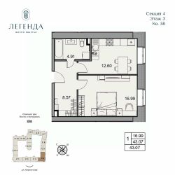 Продается светлая 1-комнатная квартира 43.07 кв.м. Этаж 3, подъезд 4.