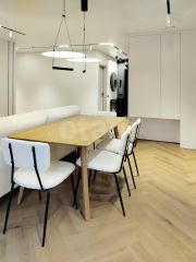 гостиная-кухня , с продуманной эргономикой, удобным диваном. Стол, стулья, дизайнерская тумба, телевизор;