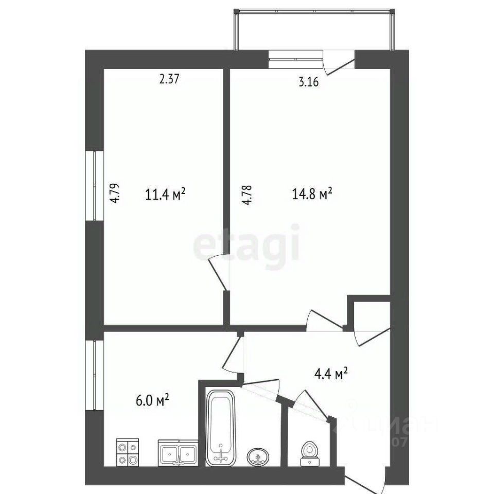 2 комнаты: 11,4 м2/ 14,8 м2.