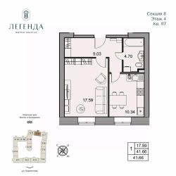 Продается светлая 1-комнатная квартира 41.66 кв.м. Этаж 4, подъезд 8.