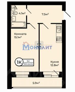 Общая площадь 42,5 кв. м, комната 15.1 кв. м., прихожая 7,5 кв. м, просторная кухня 12,8 кв. м, с выходом на лоджию, совмещенный санузел 4,1 кв. м.