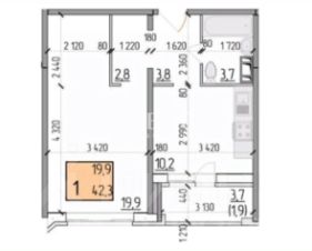 общая площадь - 42,3 м;