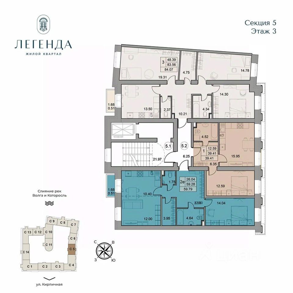 Продается светлая 2-комнатная квартира 59.79 кв.м. Этаж 3, подъезд 5.