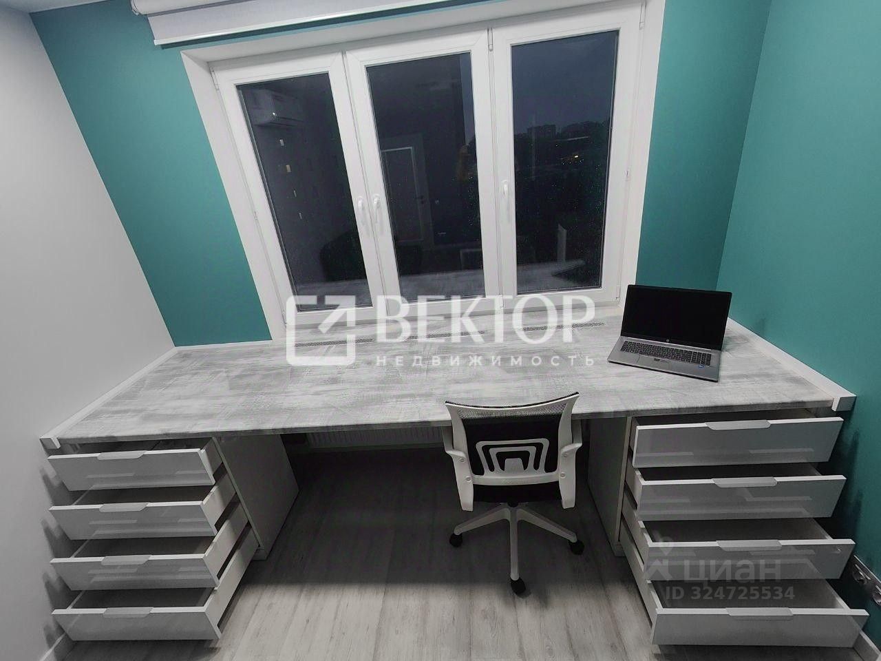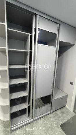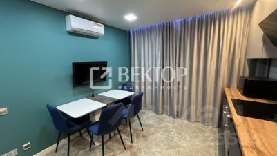 В гостиной вас встретит комфортный диван с механизмом "книжка" насыщенного изумрудного цвета - обивка из велюра, спальное место размером 200145 см. Светлая рабочая зона у окна будет удобна как при дневном, так и при искусственном освещении - столешница из износостойкого пластика размером 140300 см позволит комфортно разместиться вдвоём. Розетки, интернет и HDMI-кабели проложены под столом, есть выдвижные шкафы с доводчиками, электроштора blackout с дистанционным управлением и люстра с множеством режимов работы и отдельным пультом. Также в гостиной установлена минималистичная стенка с подсветкой и стеклянными витринами.
