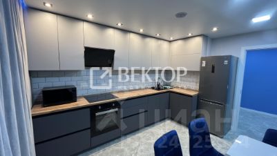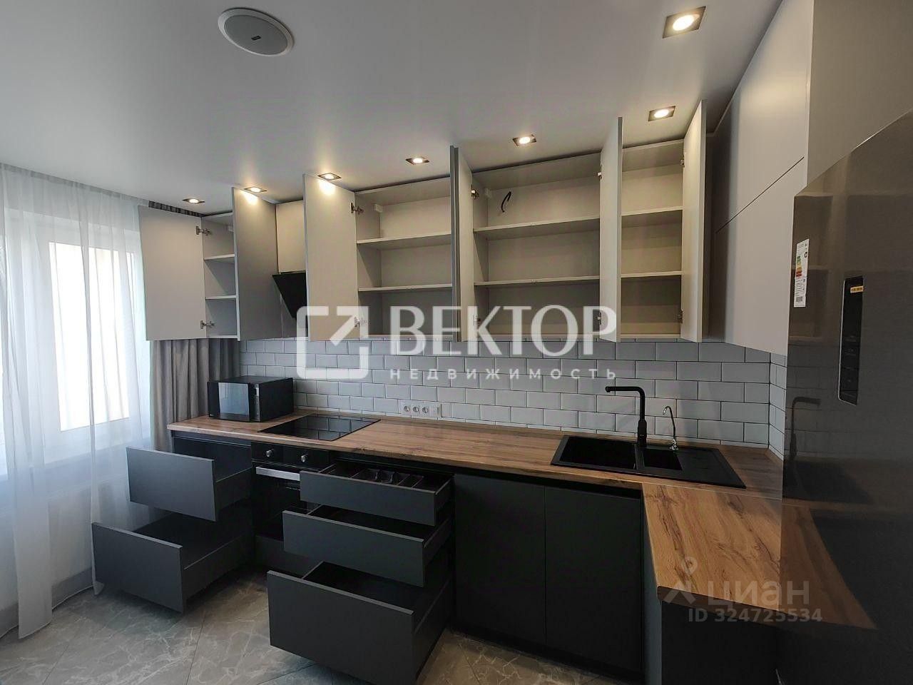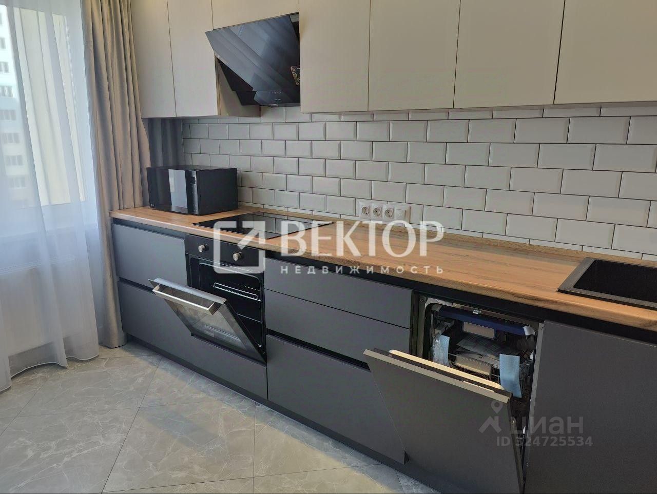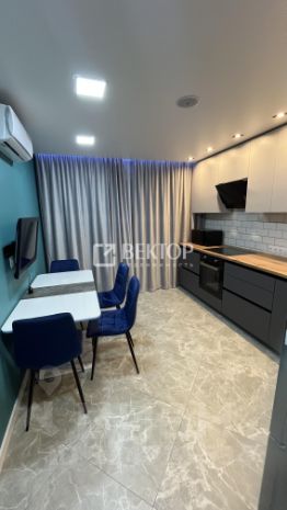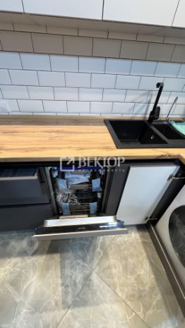 Кухня порадует встроенным гарнитуром: низ выполнен из тёмно-серого матового пластика, верх - из светло-серого матового, профиль "Гола". Установлен трёхступенчатый фильтр питьевой воды, каменная мойка и сантехника. Встроенная бытовая техника включает индукционную варочную панель, духовой шкаф, посудомойку, вытяжку ("Krona", Турция), холодильник, стирально-сушильную машину Indesit, микроволновку и TV LG с классом энергосбережения ААА - всё новое. Материал штор и стульев - велюр. Предусмотрено четыре зоны