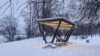 Есть просторный балкон с панорамными стёклами, откуда открывается завораживающий вид на лес.