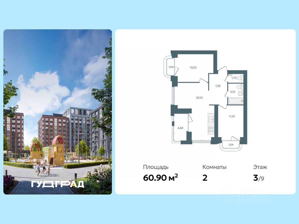 Продаётся 2-комнатная квартира в строящемся доме (Стр.1 этап 1), срок сдачи: I-кв. 2028, общей площадью 60.9 кв.м., на 3 этаже. Новый центр Заволжского района.