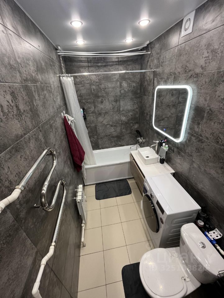 Санузел совмещенный, выполнен в современном стиле с качественной отделкой и теплым полом. Из окон открывается вид на улицу.