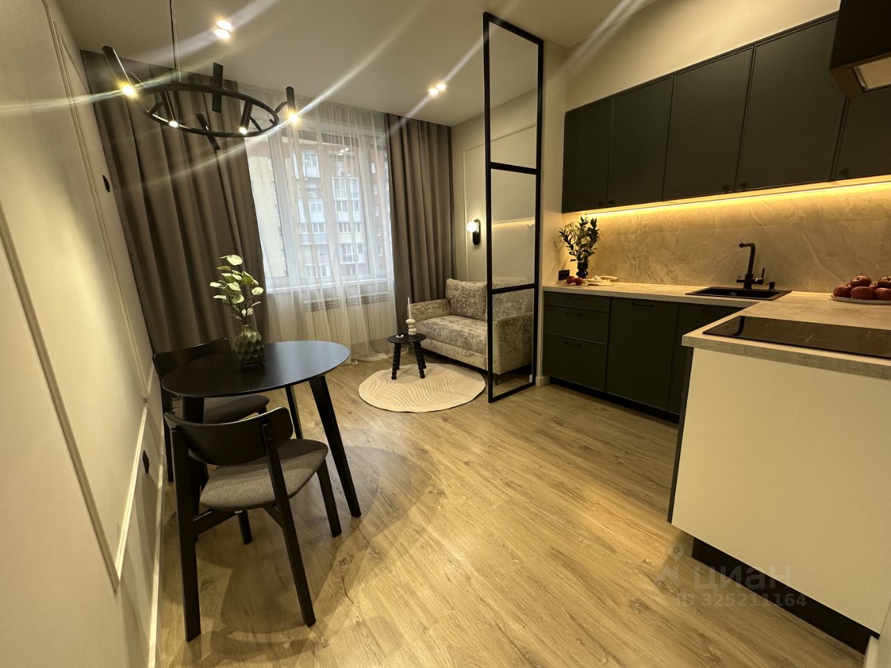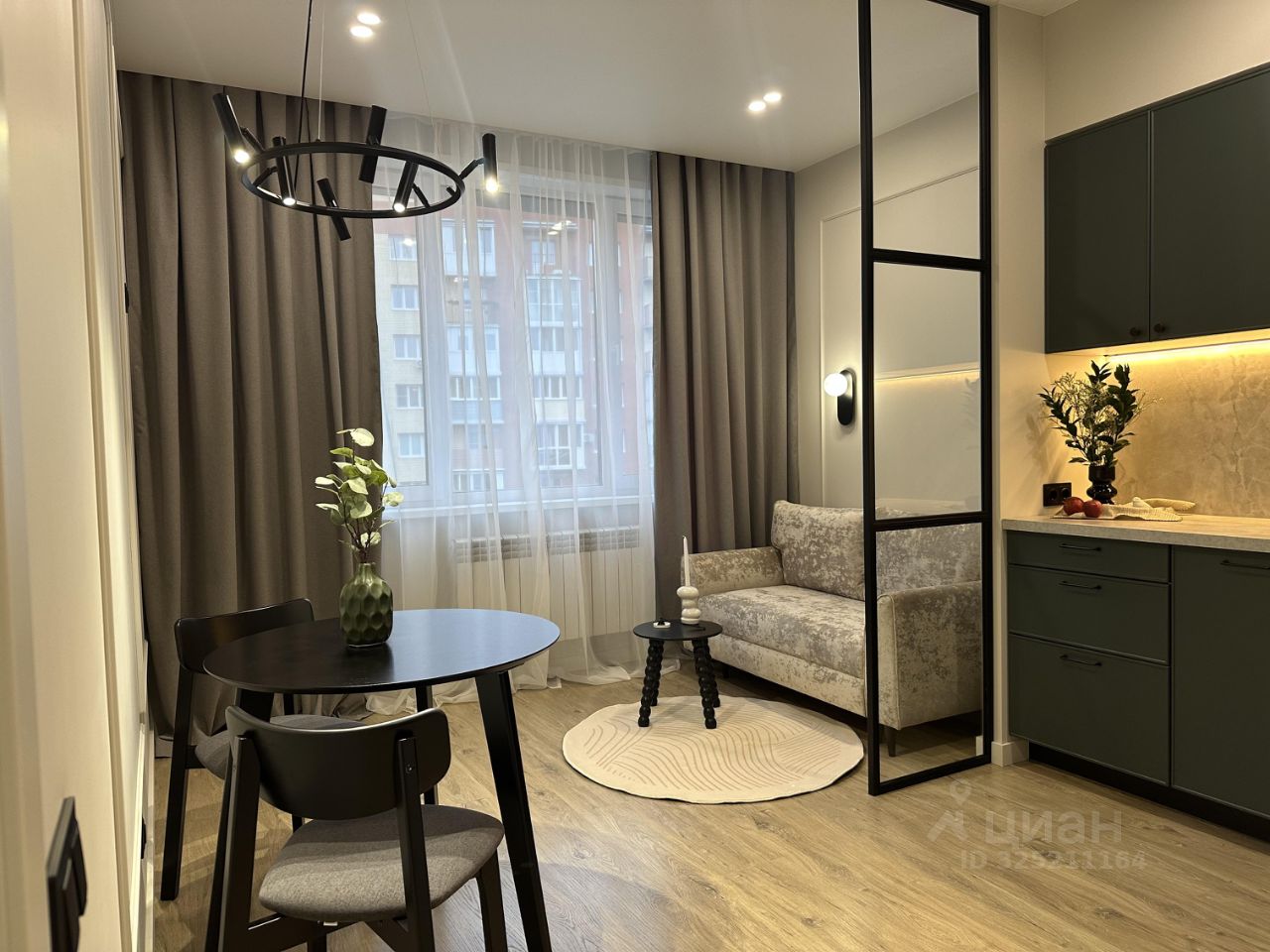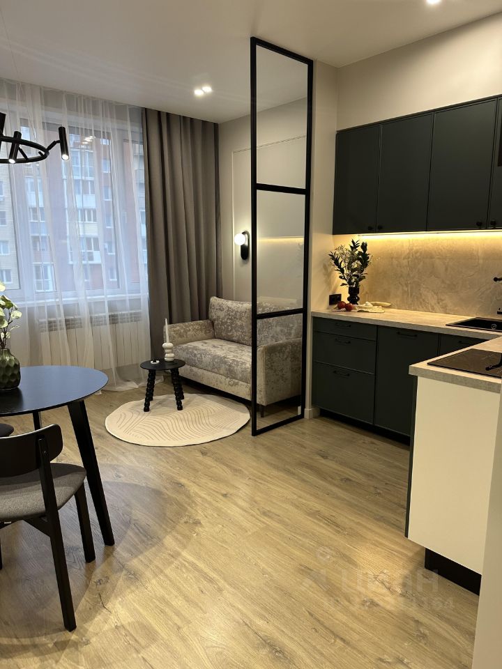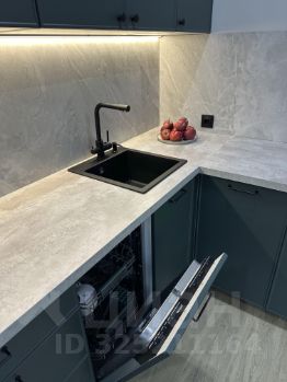 В кухне установлен функциональный кухонный гарнитур со встроенной техникой, а так же стильная обеденная зона и раскладной диван в гостиной части кухни.