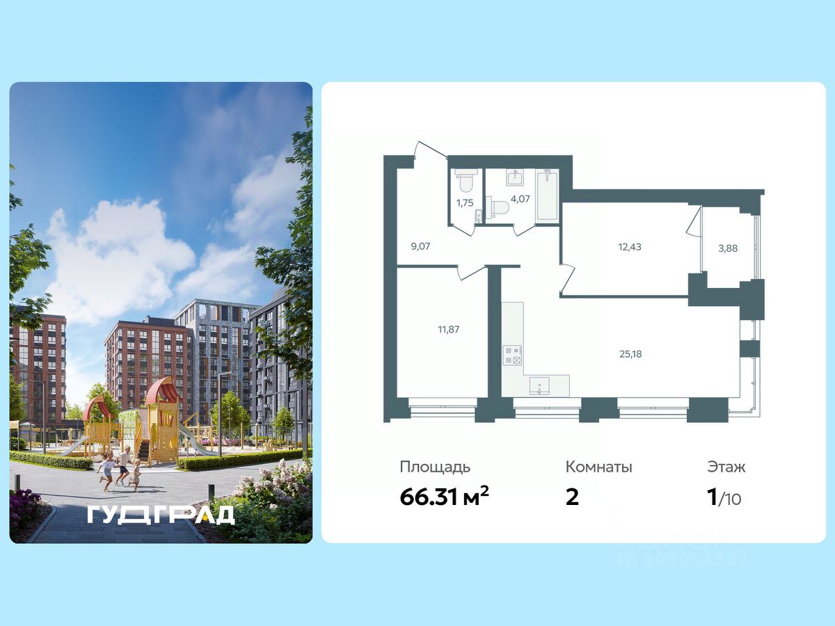 Продаётся 2-комнатная квартира в строящемся доме (Стр. 1 этап 3), срок сдачи: I-кв. 2028, общей площадью 66.31 кв.м., на 1 этаже. Новый центр Заволжского района.