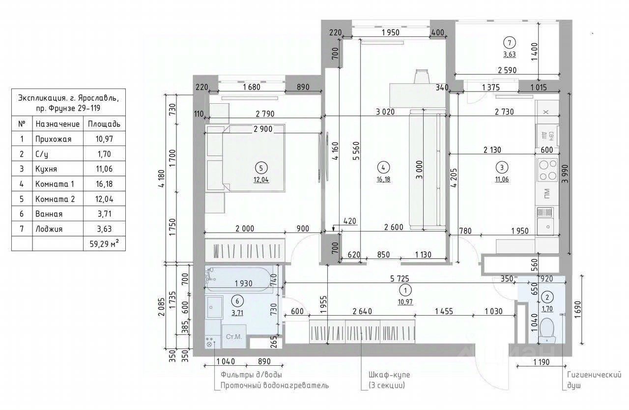 - общая площадь квартиры 55,8 кв.м. (по документам), актуальный обмерочный план прикрепляю (по замерам реальная площадь 59,29 с учетом лоджии 3,63 кв.м).