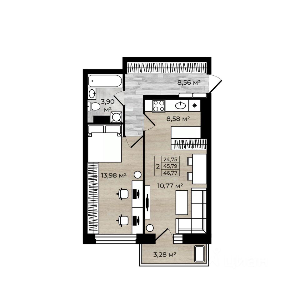 Отделка - готовая чистовая отделка в светлых нейтральных тонах.Сантехника, электрика, мебель (шкафы, мягкая мебель, кровать)Кухня (кухонный гарнитур, кухонный стол, стулья, освещение)Бытовая техника (Холодильник, посудомойка, вытяжка, варочная панель, духовой шкаф)Декор и текстиль, который дополнит интерьер и сделает его уютным для вашего проживания)