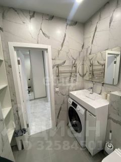 В сан узле теплый пол, шкафчик для хранения и тумба.