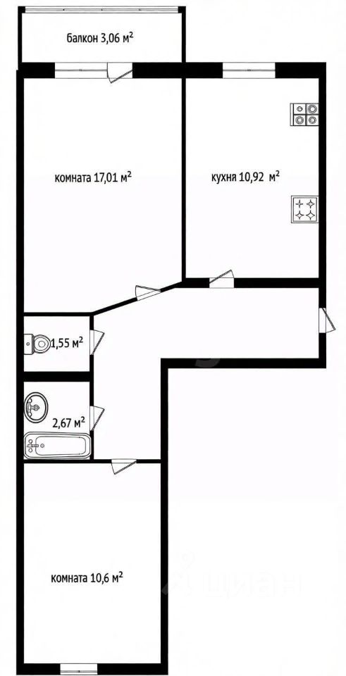 — Гостиная — 17 м² с выходом на балкон (3,06 м², не застеклён)