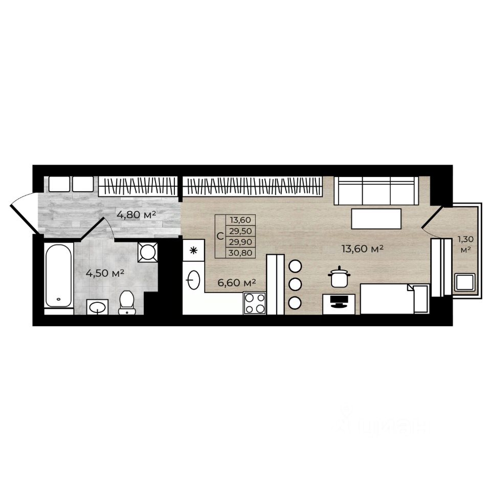 Общая площадь квартиры - 29.9 кв.м.Просторная квартира, удобная планировка, есть возможность разделения зон на спальную и кухонную.