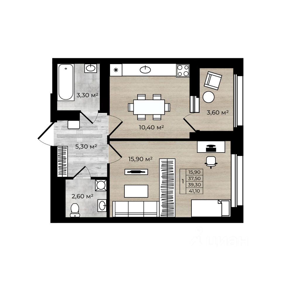 Общая площадь квартиры - 39,3 кв.м.